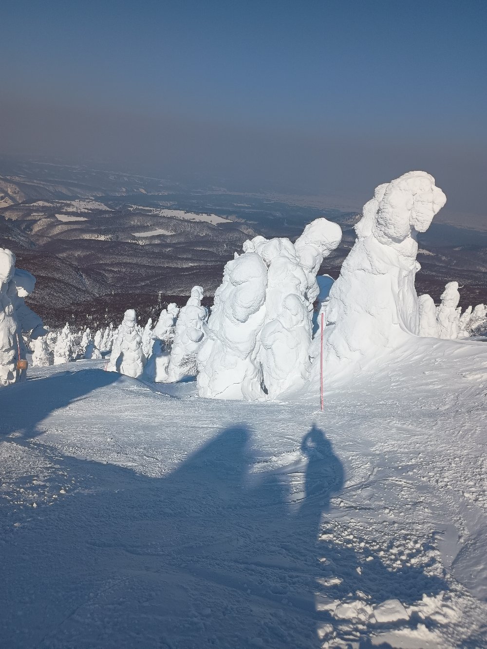 風の影響が少ないところまで降りてくると、雪面も滑りやすくなり、樹氷もきれいで、青森市内まで見渡せる視界もあって最高に気持ち良いです。