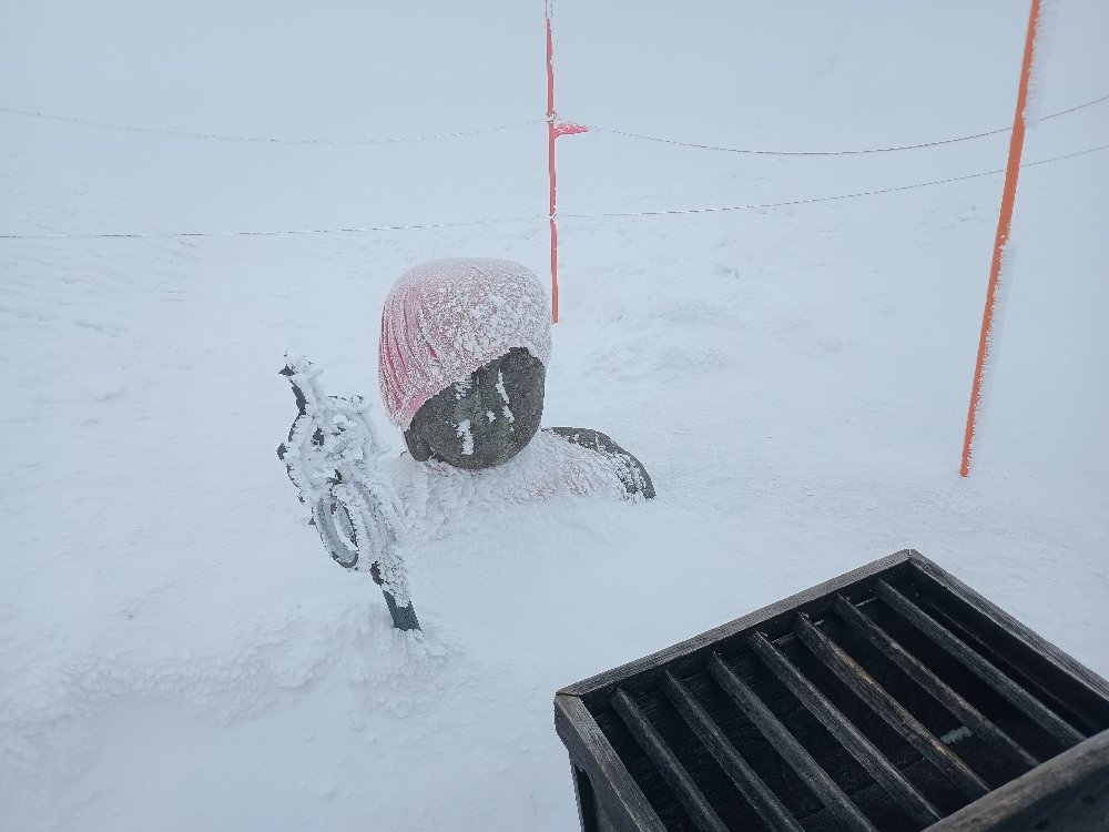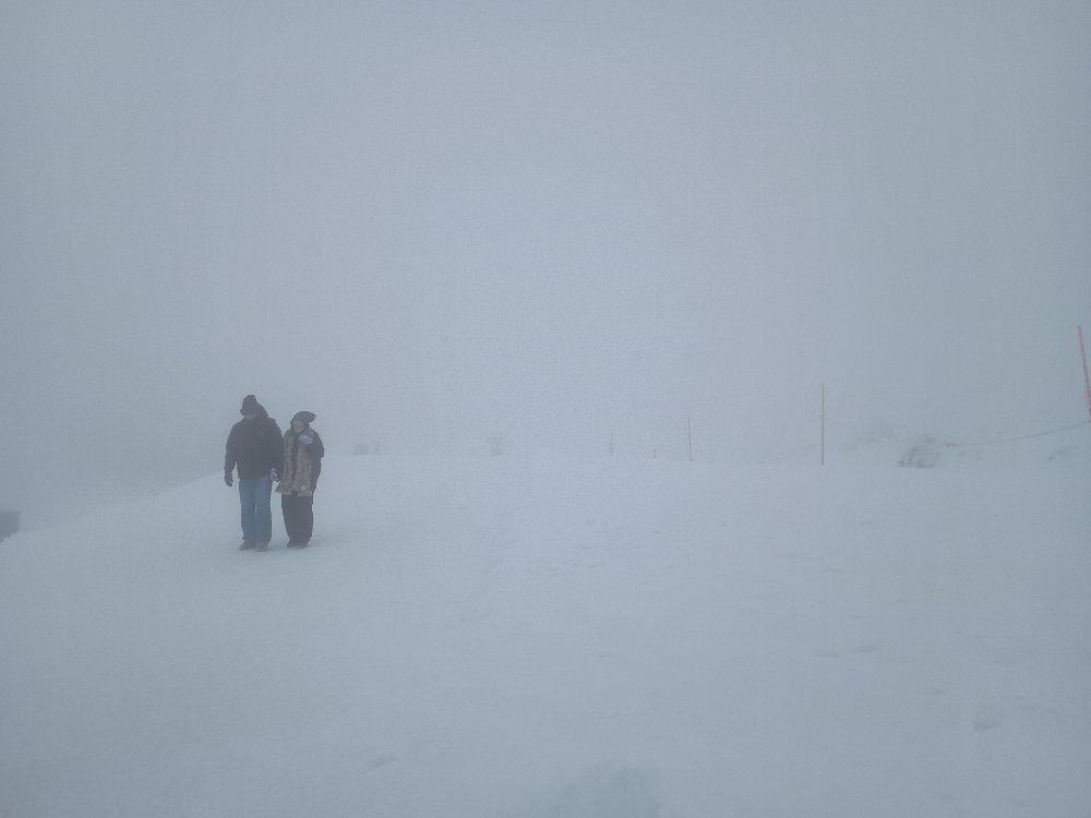 山頂はガスで見えない状況! 「百万人ゲレンデ」はホワイトアウトしそうな状況・・まだ山頂の方が良かった。これを2回繰り返すことになるとは・・とほほ!