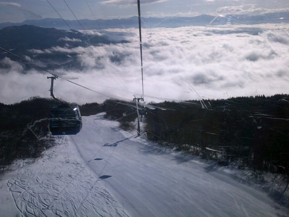 朝のうちは、ガスがゴンドラ乗り場付近まで降りてきていますが、上から見ると雲海になっているのが分かります。