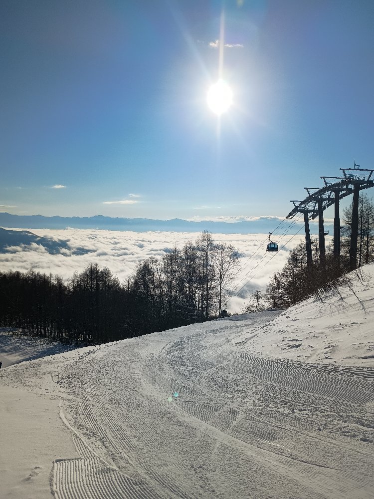 上部は視界も良く、自然雪ですがハードパックされていてロング板で滑るには最適な状況となっています。まだ雪の厚みが少ないので、グルーミングされたコースの外は、ブッシュが目立ちます(滑れないことはないですが・・)