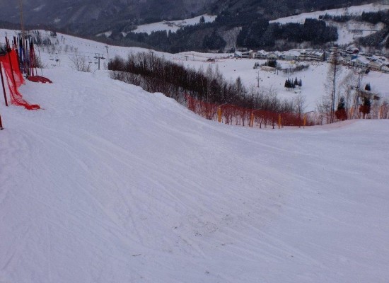 今シーズンから、アルペンコースの上部(廊下からの肩)が広くなるように、コースが改修されました。下に向かって左片斜面が増えましたが、ここにポールセットされると、転倒者続出の難セッティングになってしまいます。やはり国体を見据えた改修なのでしょう?!