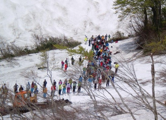 大斜面も、かなり雪が少なくなりましたが、来週末までは、スキーを履いてリフト乗車ができます。6月13日以降は、板を外してのリフト乗車になりそうです。