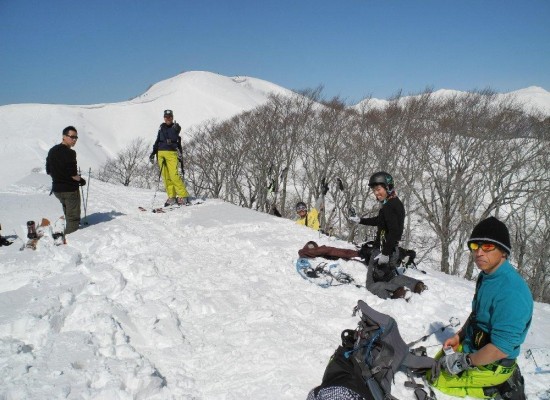 私以外はスノーボードですが、シール登行する(楽なので)ために、「スプリットボード」という半分に割れるスノーボードを使う人が増えています。登りは山スキー、下り(滑り)はボードになります。