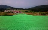 プラスノーは、草が生えにくいように穴の開いたシート状になっています。昨年オープンしたと聞いているのですが、かなりブラシが痛んでいるところがあります。